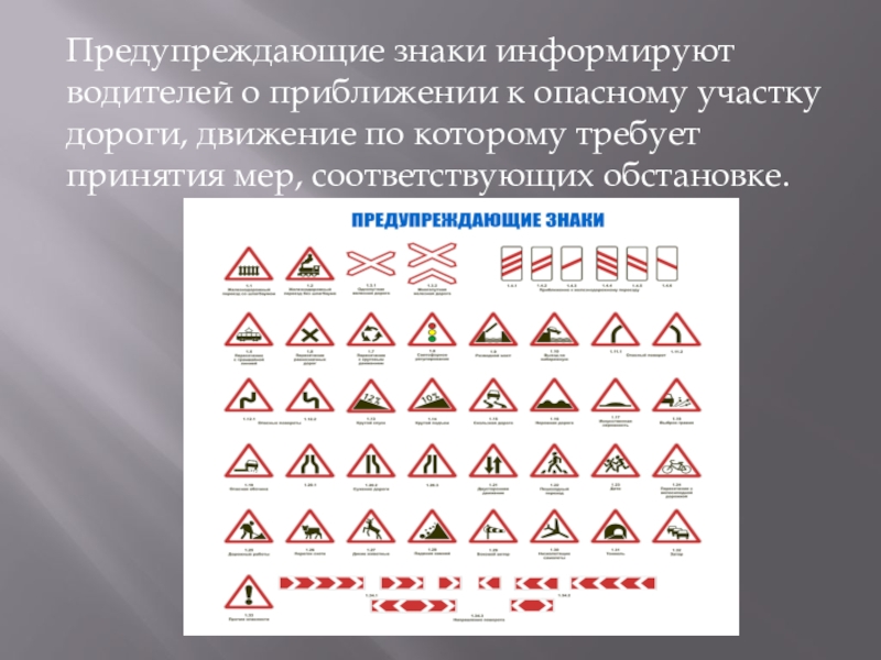 Предупреждающие знаки информируют водителей о приближении к опасному участку дороги, движение по которому требует принятия мер, соответствующих обстановке.