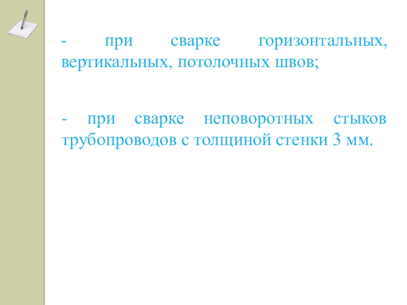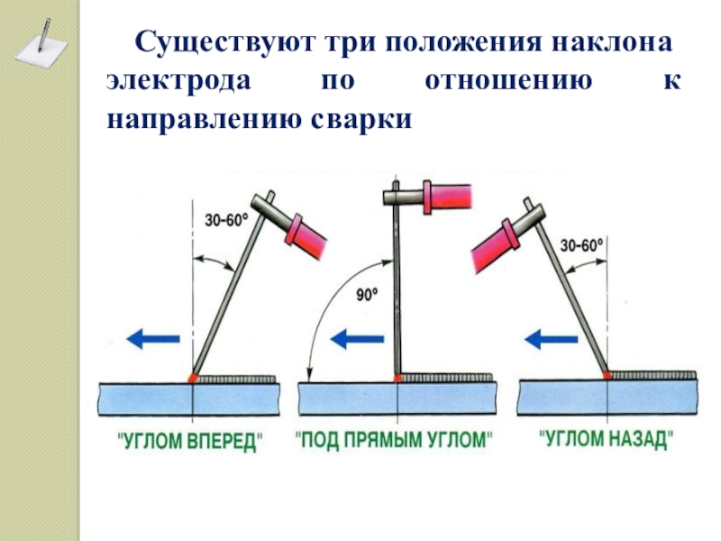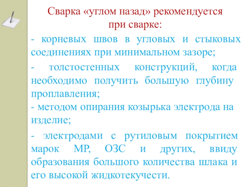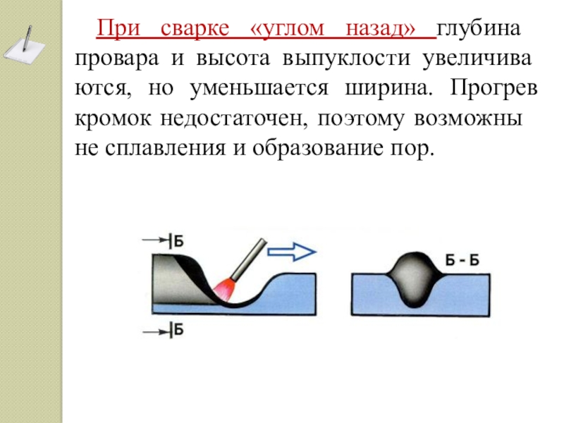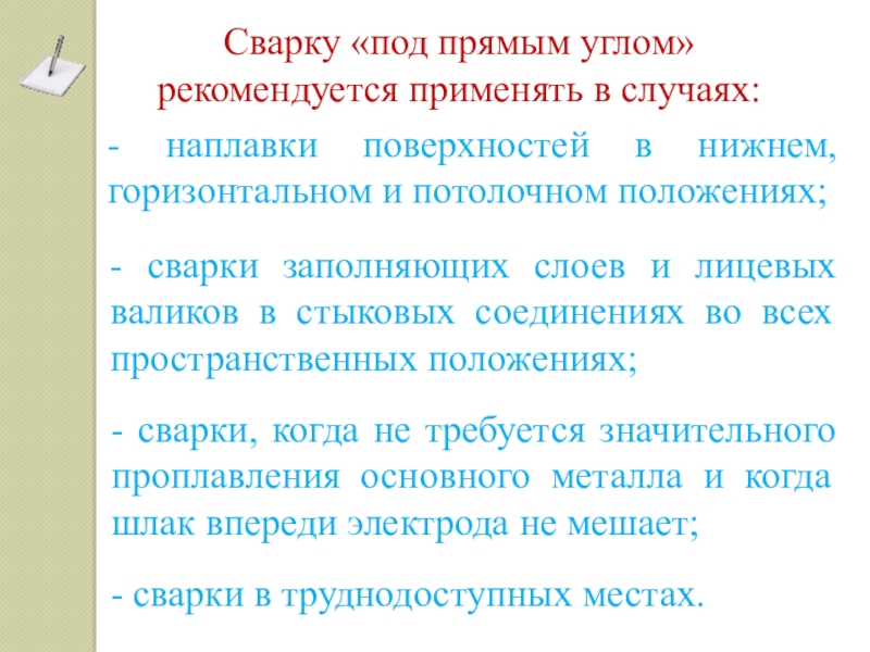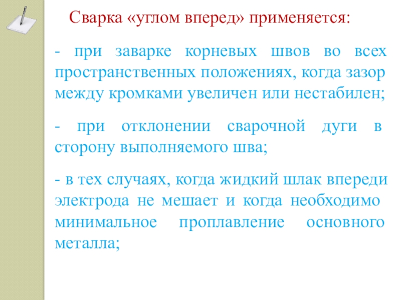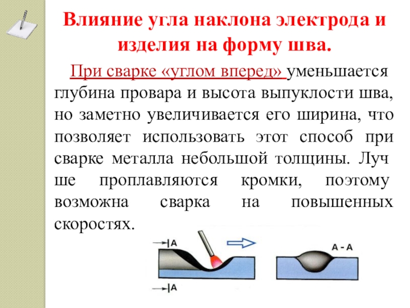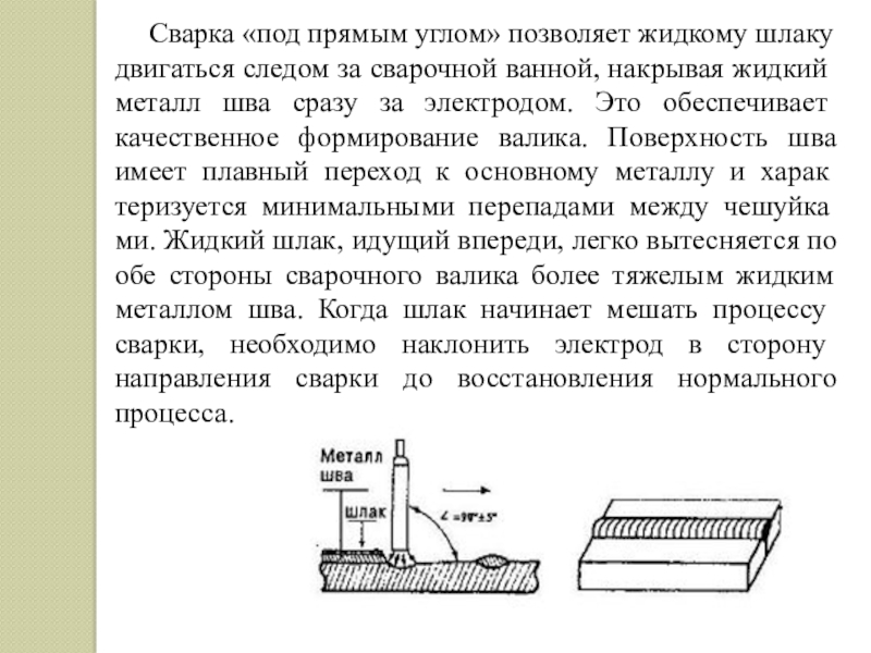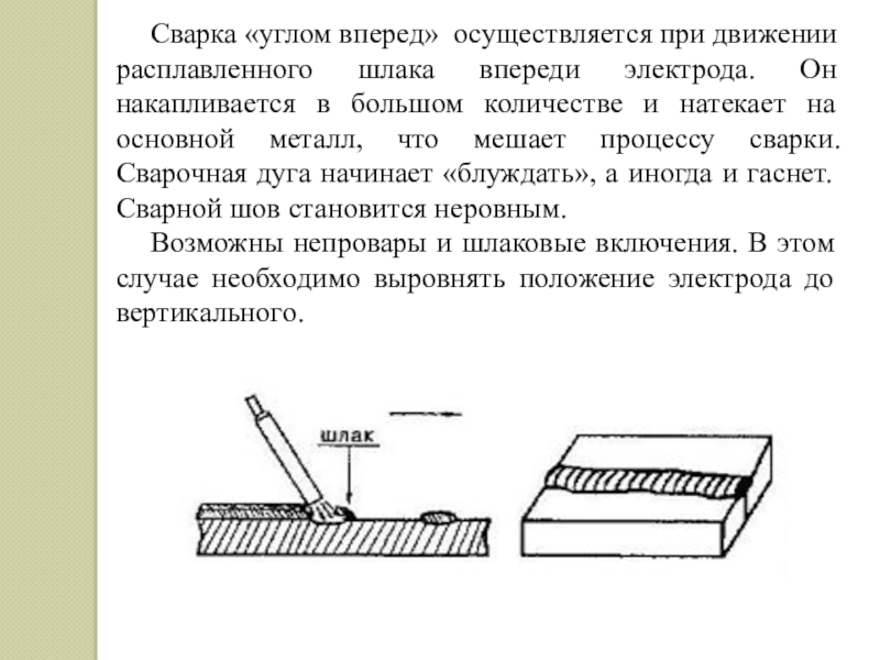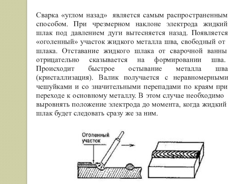 - сварки, когда не требуется значительного проплавления основного металла и когда шлак впереди электрода не мешает;