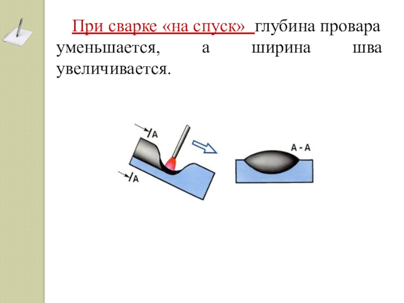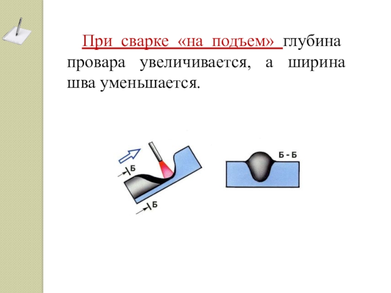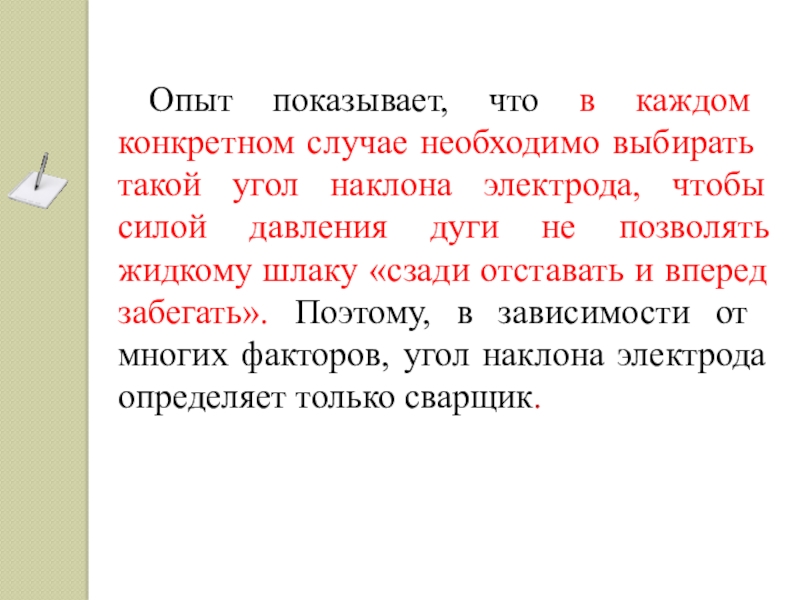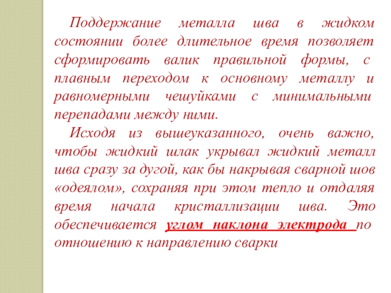 - в тех случаях, когда жидкий шлак впереди электрода не мешает и когда необходимо минимальное проплавление основного металла;