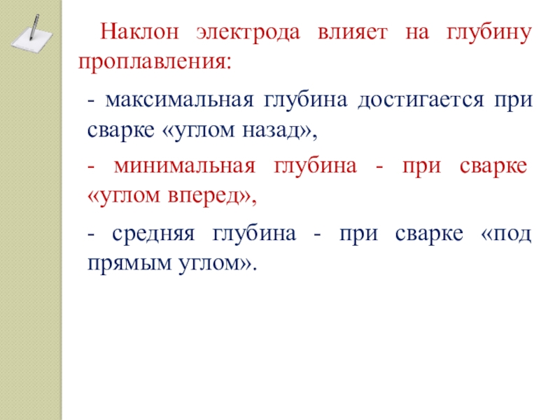 - минимальная глубина - при сварке «углом вперед»,