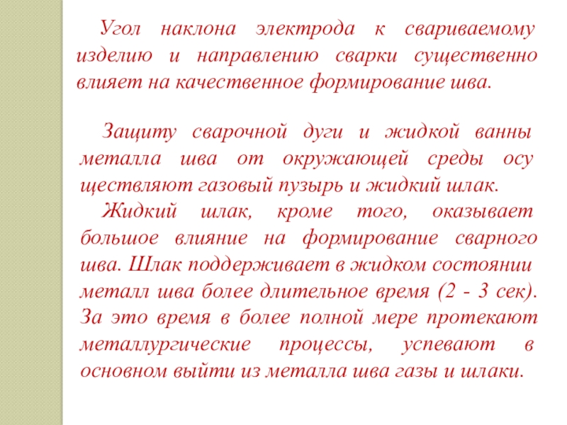 Жидкий шлак, кроме того, оказывает большое влияние на формирование сварного шва. Шлак поддерживает в жидком состоянии металл шва более длительное время (2 - 3 сек). За это время в более полной мере протекают металлургические процессы, успевают в основном выйти из металла шва газы и шлаки.