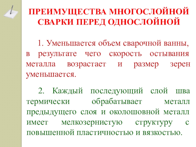 2. Каждый последующий слой шва термически обрабатывает металл предыдущего слоя и околошовной металл имеет мелкозернистую структуру с повышенной пластичностью и вязкостью.