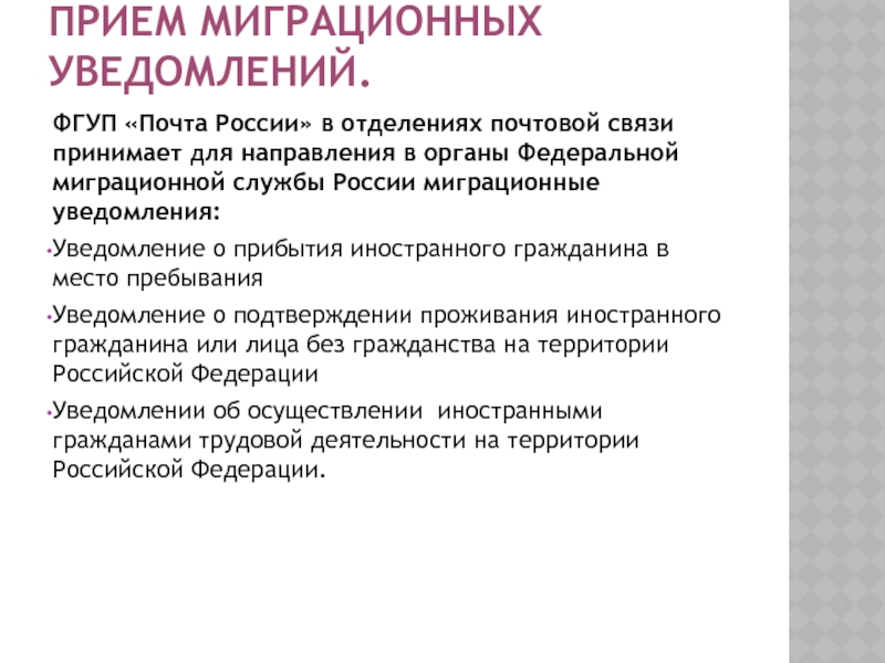 Прием миграционных уведомлений.ФГУП «Почта России» в отделениях почтовой связи принимает для направления в органы Федеральной миграционной службы
