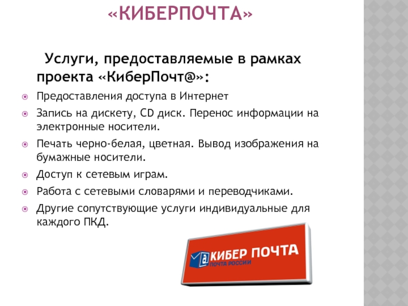 «КиберПочта» 	Услуги, предоставляемые в рамках проекта «КиберПочт@»: Предоставления доступа в ИнтернетЗапись на дискету, CD диск. Перенос
