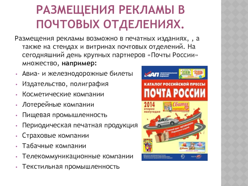 а также на стендах и витринах почтовых отделений. На сегодняшний день крупных партнеров «Почты России» множество, например: