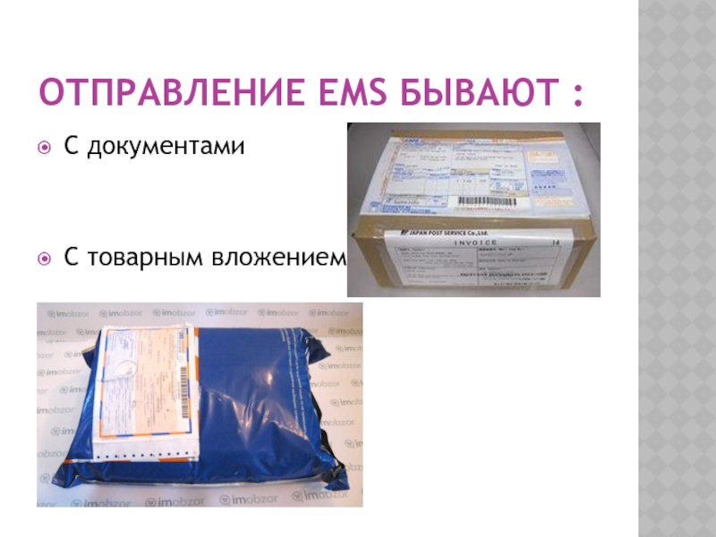 Отправление ЕМS бывают :С документами С товарным вложением