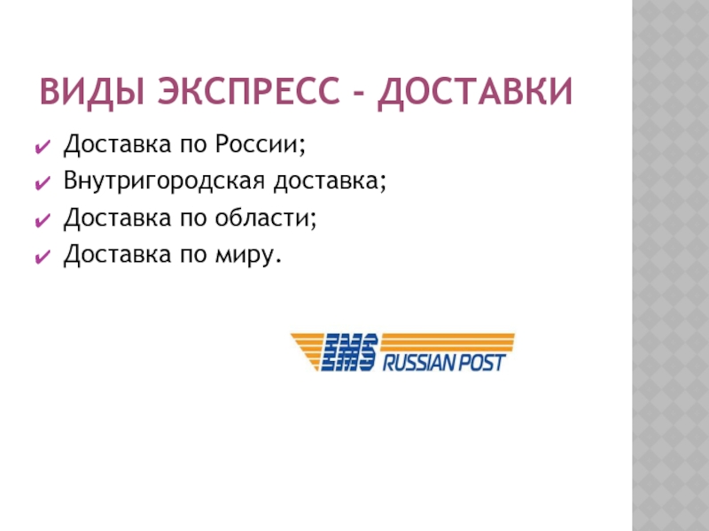 Виды экспресс - доставкиДоставка по России; Внутригородская доставка; Доставка по области; Доставка по миру.