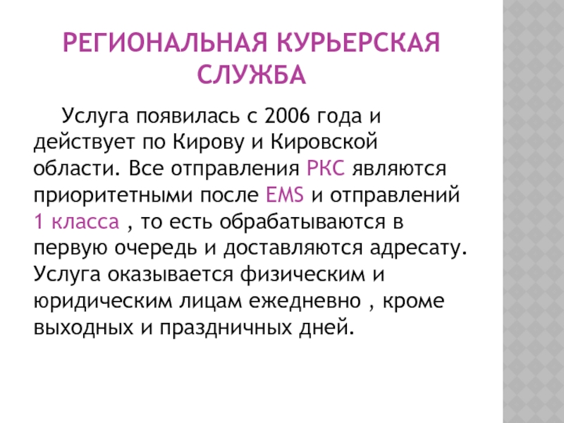 Региональная курьерская служба 	Услуга появилась с 2006 года и действует по Кирову и Кировской области. Все отправления