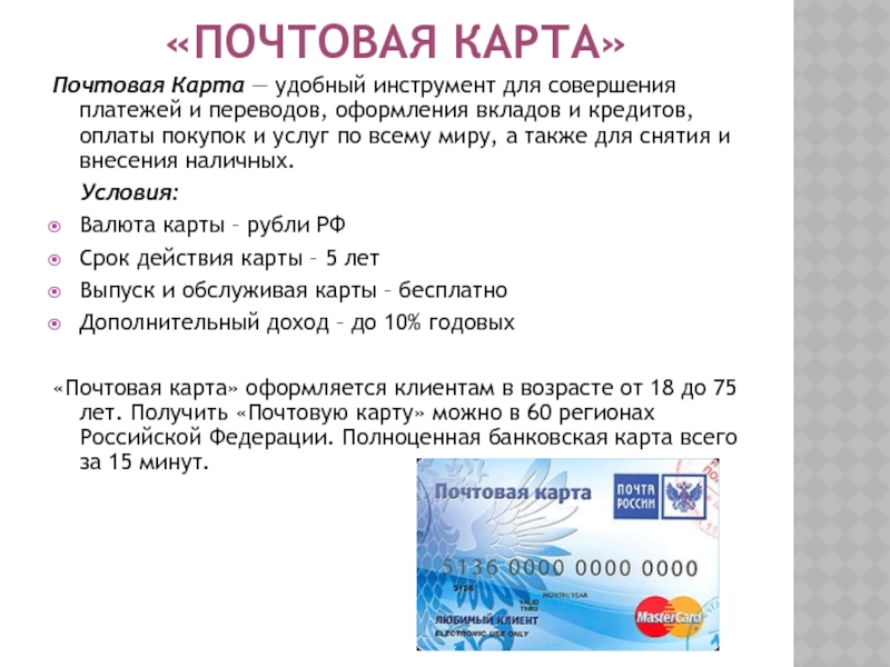 «Почтовая карта» оформляется клиентам в возрасте от 18 до 75 лет. Получить «Почтовую карту» можно в 60 регионах Российской Федерации. Полноценная банковская карта всего за 15 минут.