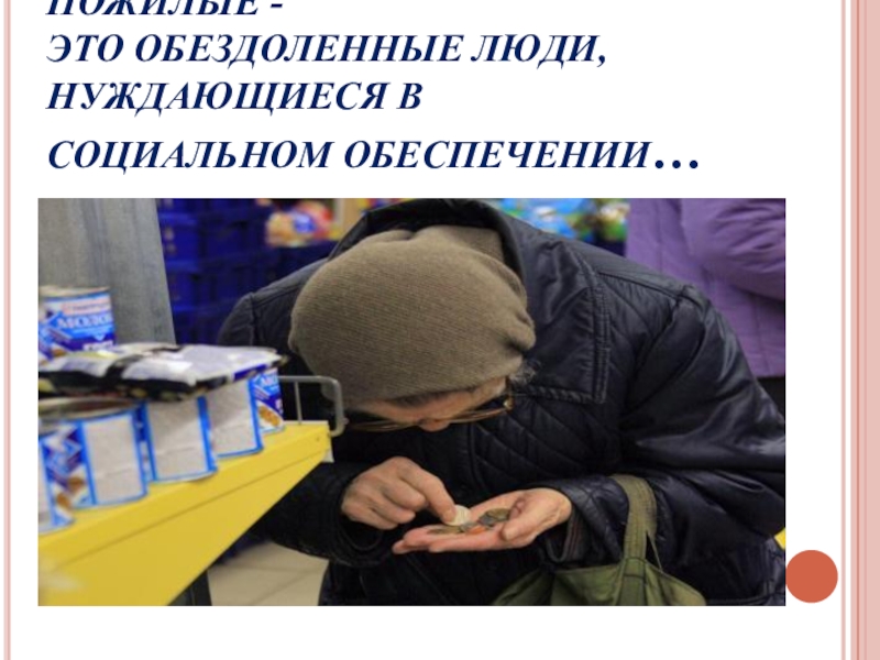 Слайд 13ПОЖИЛЫЕ - ЭТО ОБЕЗДОЛЕННЫЕ ЛЮДИ, НУЖДАЮЩИЕСЯ В СОЦИАЛЬНОМ ОБЕСПЕЧЕНИИ…