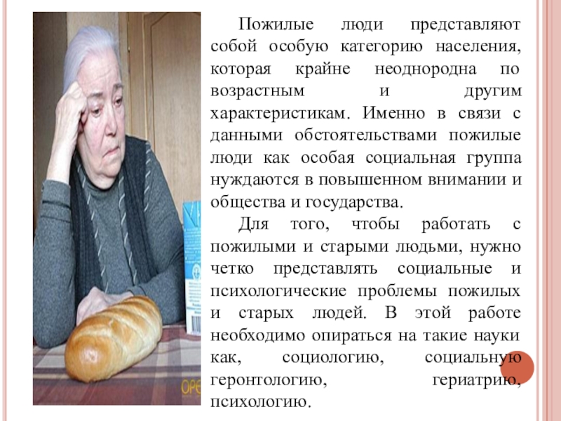 Для того, чтобы работать с пожилыми и старыми людьми, нужно четко представлять социальные и психологические проблемы пожилых и старых людей. В этой работе необходимо опираться на такие науки как, социологию, социальную геронтологию, гериатрию, психологию.