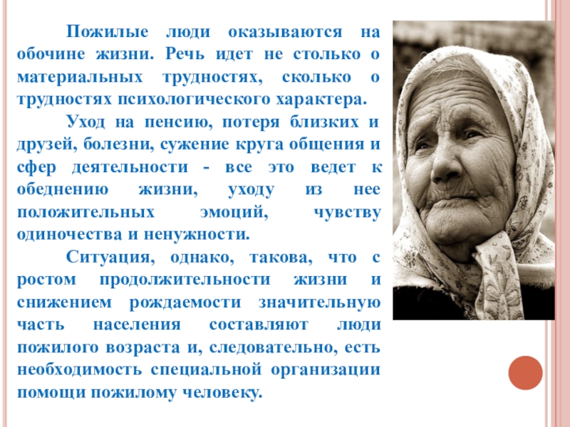 Слайд 6Пожилые люди оказываются на обочине жизни. Речь идет не столько о