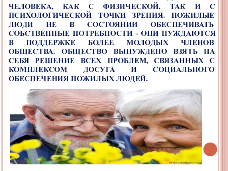 ТАК И С ПСИХОЛОГИЧЕСКОЙ ТОЧКИ ЗРЕНИЯ. ПОЖИЛЫЕ ЛЮДИ НЕ В СОСТОЯНИИ ОБЕСПЕЧИВАТЬ СОБСТВЕННЫЕ ПОТРЕБНОСТИ - ОНИ НУЖДАЮТСЯ В ПОДДЕРЖКЕ БОЛЕЕ МОЛОДЫХ ЧЛЕНОВ ОБЩЕСТВА. ОБЩЕСТВО ВЫНУЖДЕНО ВЗЯТЬ НА СЕБЯ РЕШЕНИЕ ВСЕХ ПРОБЛЕМ, СВЯЗАННЫХ С КОМПЛЕКСОМ ДОСУГА И СОЦИАЛЬНОГО ОБЕСПЕЧЕНИЯ ПОЖИЛЫХ ЛЮДЕЙ.
