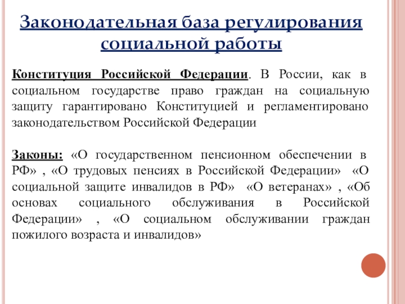 Законы: «О государственном пенсионном обеспечении в РФ» , «О трудовых пенсиях в Российской Федерации» «О социальной защите инвалидов в РФ» «О ветеранах» , «Об основах социального обслуживания в Российской Федерации» , «О социальном обслуживании граждан пожилого возраста и инвалидов»