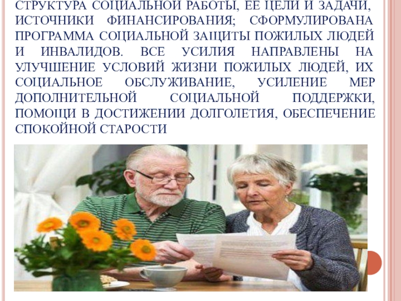 И ЗАДАЧИ, ИСТОЧНИКИ ФИНАНСИРОВАНИЯ; СФОРМУЛИРОВАНА ПРОГРАММА СОЦИАЛЬНОЙ ЗАЩИТЫ ПОЖИЛЫХ ЛЮДЕЙ И ИНВАЛИДОВ. ВСЕ УСИЛИЯ НАПРАВЛЕНЫ НА УЛУЧШЕНИЕ УСЛОВИЙ ЖИЗНИ ПОЖИЛЫХ ЛЮДЕЙ, ИХ СОЦИАЛЬНОЕ ОБСЛУЖИВАНИЕ, УСИЛЕНИЕ МЕР ДОПОЛНИТЕЛЬНОЙ СОЦИАЛЬНОЙ ПОДДЕРЖКИ, ПОМОЩИ В ДОСТИЖЕНИИ ДОЛГОЛЕТИЯ, ОБЕСПЕЧЕНИЕ СПОКОЙНОЙ СТАРОСТИ