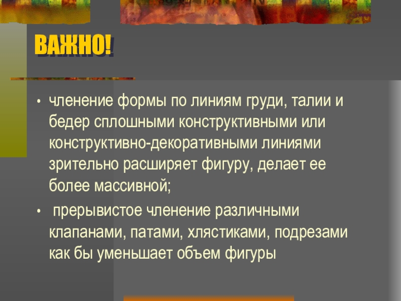 конструктивно-декоративными линиями зрительно расширяет фигуру, делает ее более массивной;