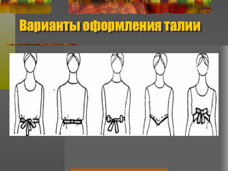 а л и и. Эту линию можно выразить прямыми, ломаными или плавными кривыми линиями (рис. 65). Соединяя лиф с юбкой, эта линия является сугубо конструктивной и ее, как правило, закрывают поясом различной формы и ширины. Пояс с пряжкой, переброской, завязками, бантом является элементом, оформляющим и маскирующим конструктивную линию соединения лифа с юбкой. Если же линию оставляют открытой, ее декоративно оформляют, применяя машинную строчку, кант, бейку, сборки, придавая ей различную форму