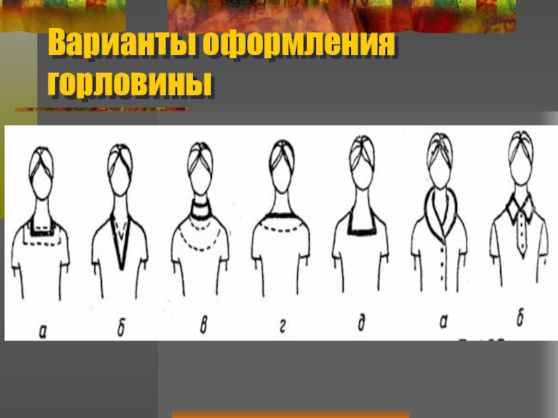 В некоторых композиционных решениях форма линии горловины сочетается с формой застежки. Горловина может быть оформлена воротником различной формы, выявляющей стиль и назначение модели