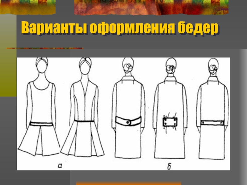 В ряде композиционных решений линию бедер подчеркивают различными декоративными элементами: складками, подрезами, хлястиками, бейками, бантами, патами, отделочной строчкой и т. д.