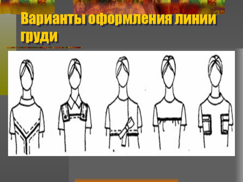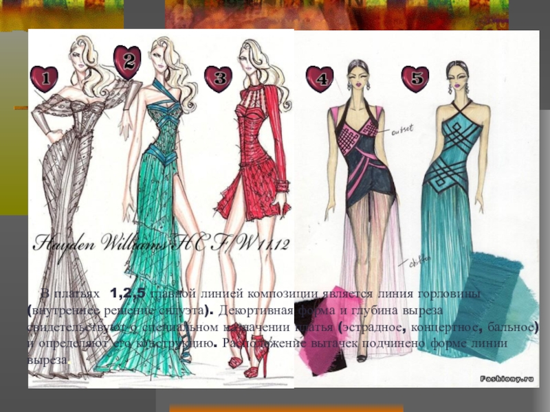 Слайд 20 В платьях 1,2,5 главной линией композиции является линия горловины (внутреннее