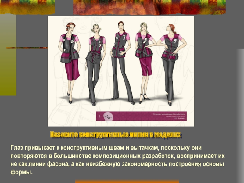 Конструктивность всех этих линий заключается в том, что они дополняют конструктивное построение внутри самой формы, заменяя отчасти соответствующие вытачки. , т.е участвуют в формообразовании;