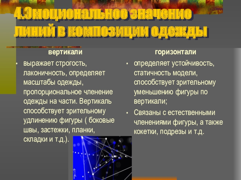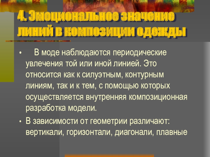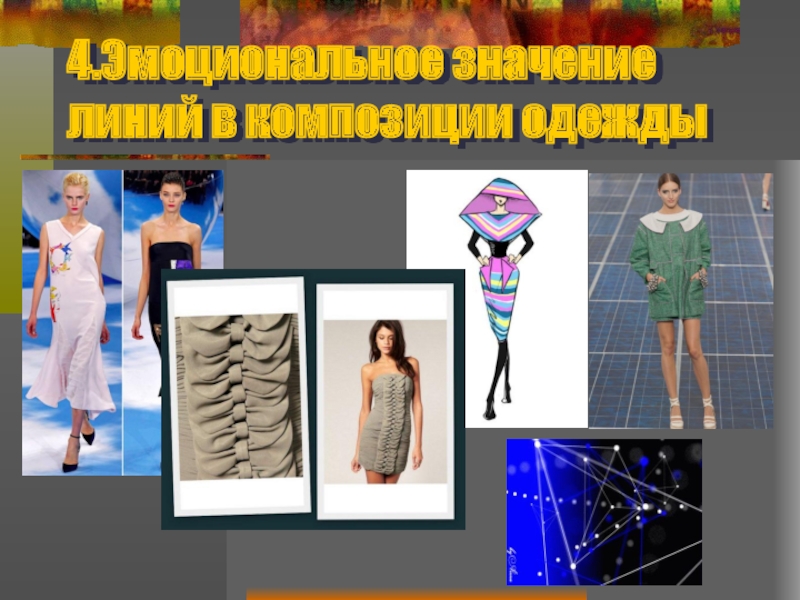 Слайд 354. Эмоциональное значение линий в композиции одежды