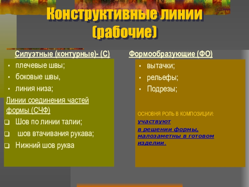 В одежде различают основные группы линий по их роли в создании формы и фасонов модели