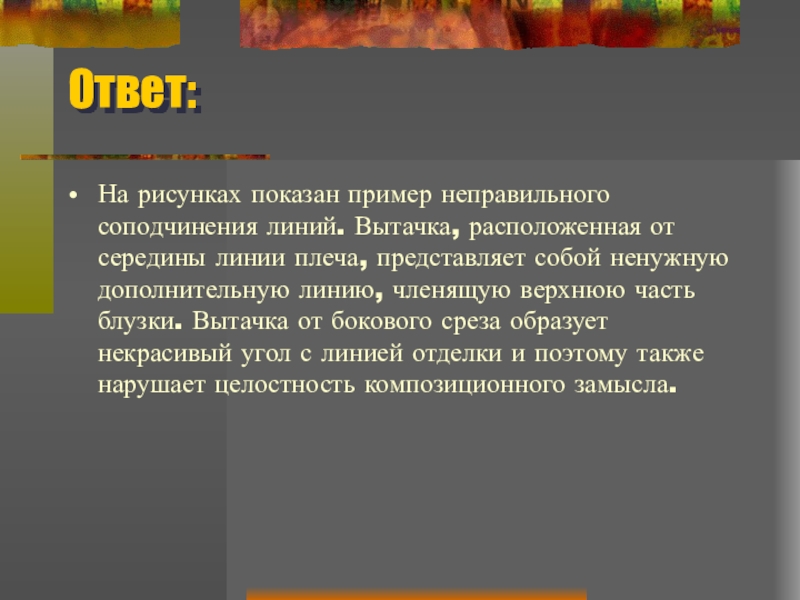 линии плеча, представляет собой ненужную дополнительную линию, членящую верхнюю часть блузки. Вытачка от бокового среза образует некрасивый угол с линией отделки и поэтому также нарушает целостность композиционного замысла.
