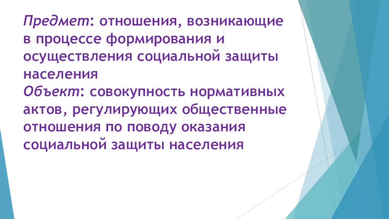 Предмет: отношения, возникающие в процессе формирования и осуществления социальной защиты населения Объект: совокупность нормативных актов, регулирующих общественные