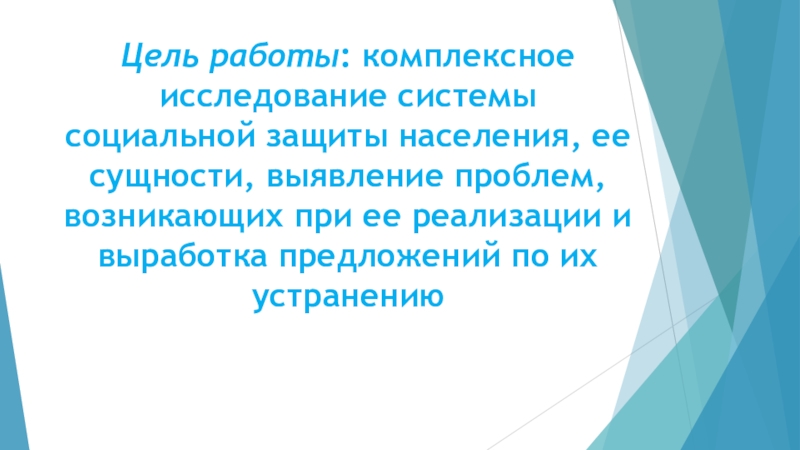 Слайд 2Цель работы: комплексное исследование системы социальной защиты населения, ее сущности, выявление