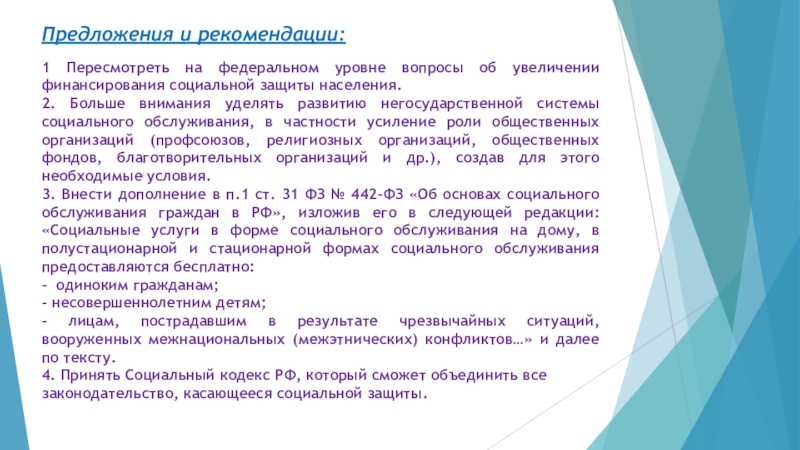 Предложения и рекомендации: 1 Пересмотреть на федеральном уровне вопросы об увеличении финансирования социальной защиты населения.2. Больше внимания