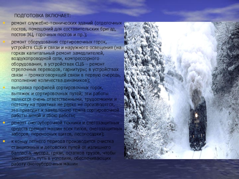 к концу летнего периода производится очистка станционных и деповских путей от излишнего балласта, мусора, грязи, остатков грузов, чтобы заморозить путь в условиях, обеспечивающих работу снегоуборочных машин