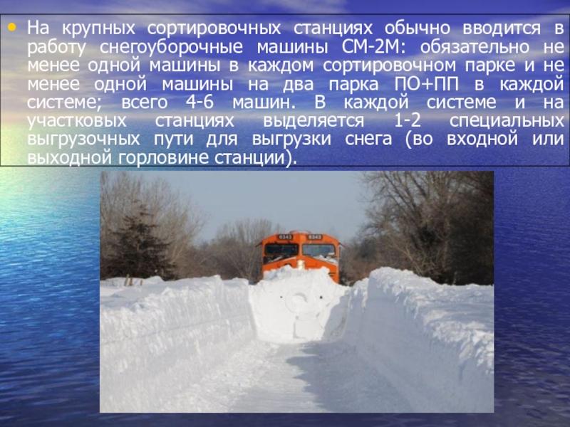 Слайд 18На крупных сортировочных станциях обычно вводится в работу снегоуборочные машины СМ-2М: