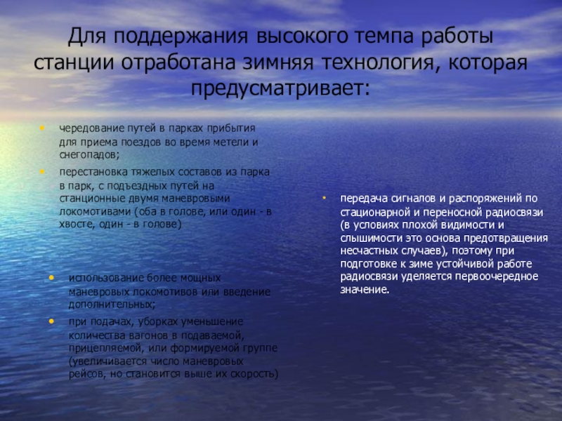 Слайд 9Для поддержания высокого темпа работы станции отработана зимняя технология, которая предусматривает: