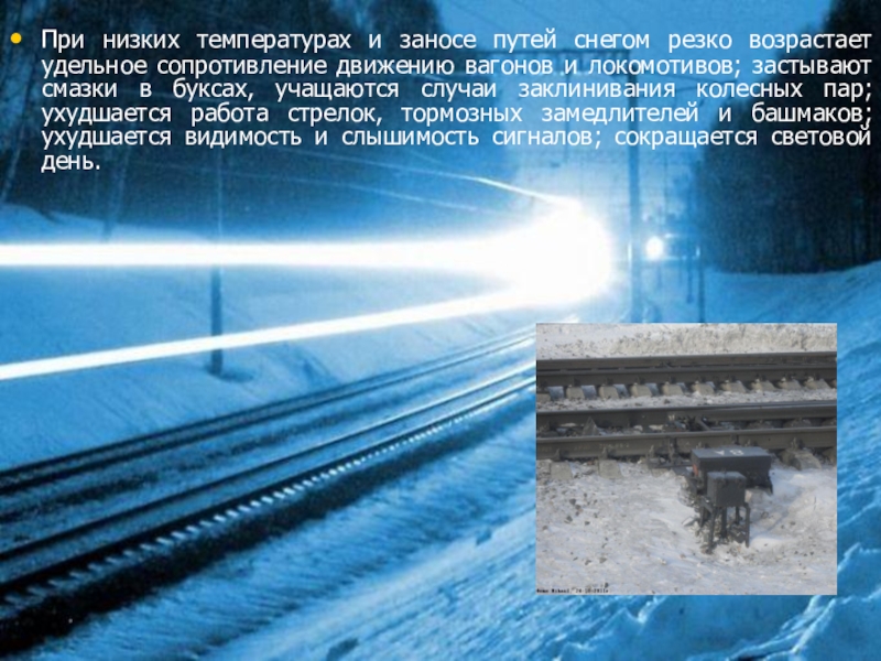движению вагонов и локомотивов; застывают смазки в буксах, учащаются случаи заклинивания колесных пар; ухудшается работа стрелок, тормозных замедлителей и башмаков; ухудшается видимость и слышимость сигналов; сокращается световой день.