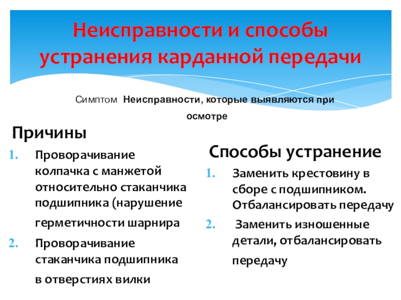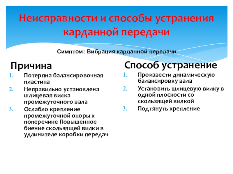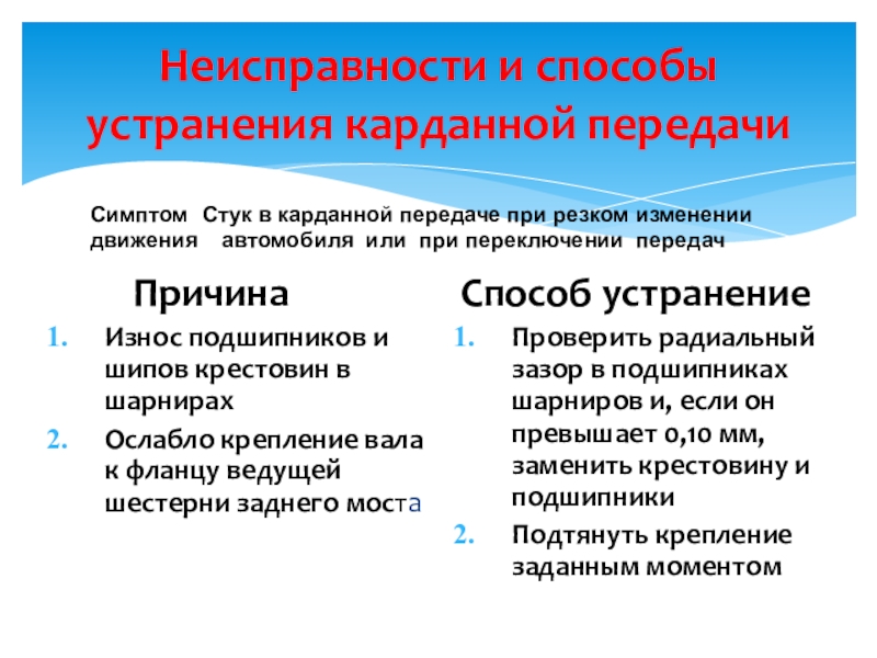 Симптом: Стук в карданной передаче при резком изменении движения автомобиля или при переключении передач