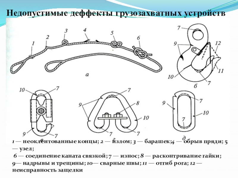 6 — соединение каната связкой; 7 — износ; 8 — расконтривание гайки; 9— надрывы и трещины; 10— сварные швы; 11 — отгиб рога; 12 — неисправность защелки