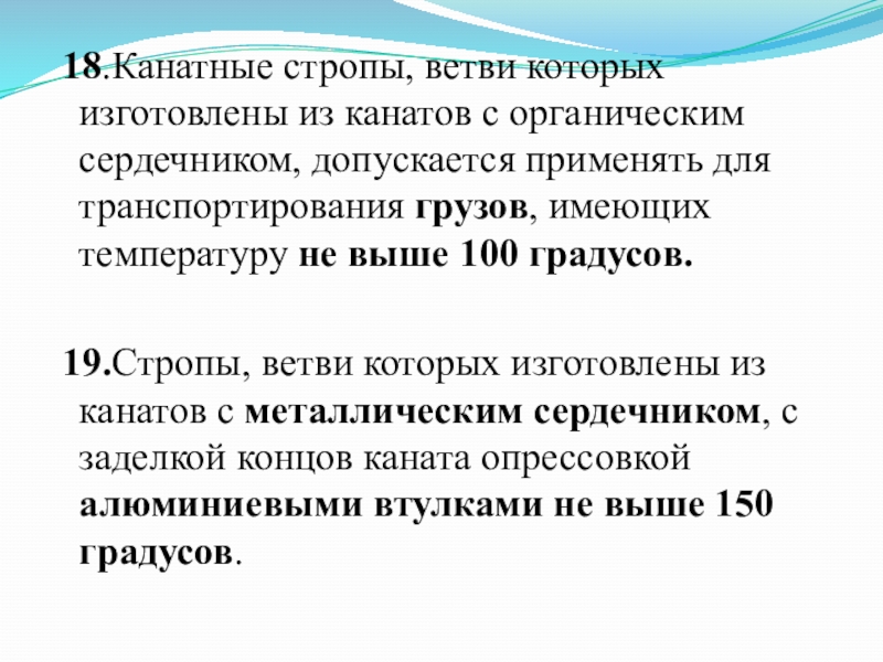 Слайд 20 18.Канатные стропы, ветви которых изготовлены из канатов с органическим сердечником,