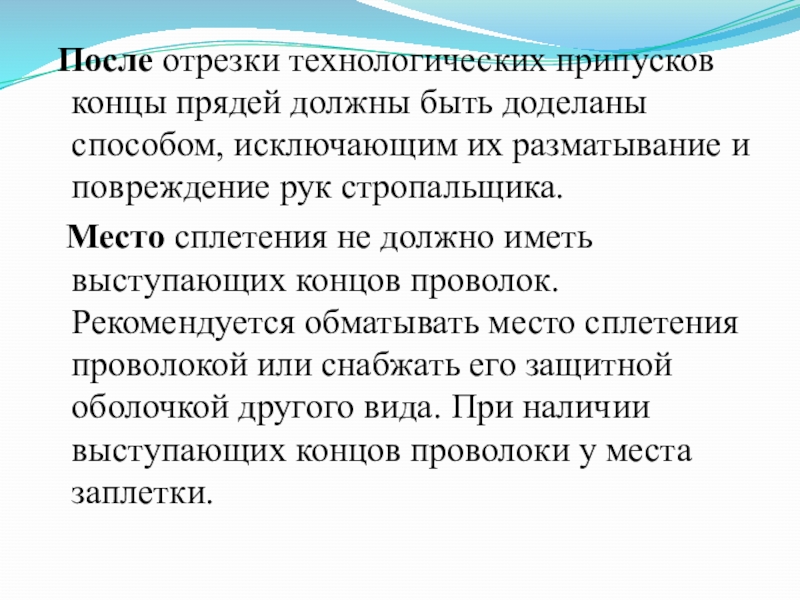 Mecто cплетения не должно иметь выступающих концов проволок. Рекомендуется обматывать место сплетения проволокой или снабжать его защитной оболочкой другого вида. При наличии выступающих концов проволоки у места заплетки.