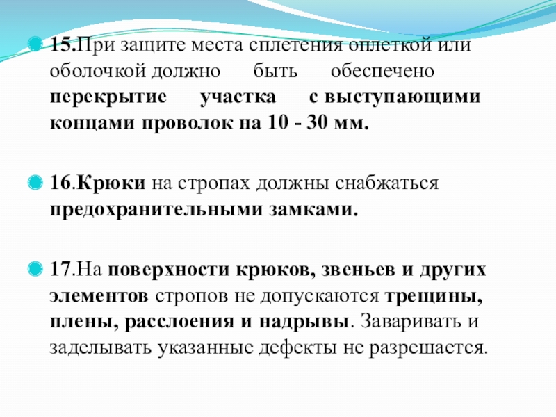 Слайд 1515.При защите места сплетения оплеткой или оболочкой должно быть
