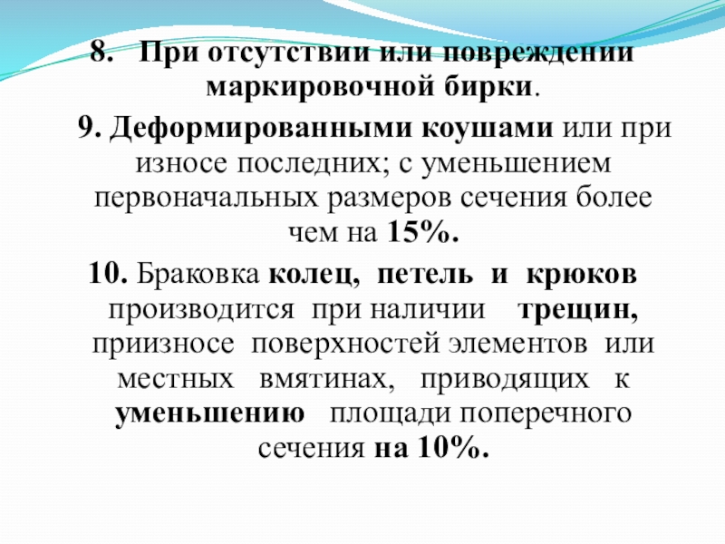 10. Браковка колец, петель и крюков производится при наличии трещин, приизносе поверхностей элементов или местных вмятинах, приводящих к уменьшению площади поперечного сечения на 10%.