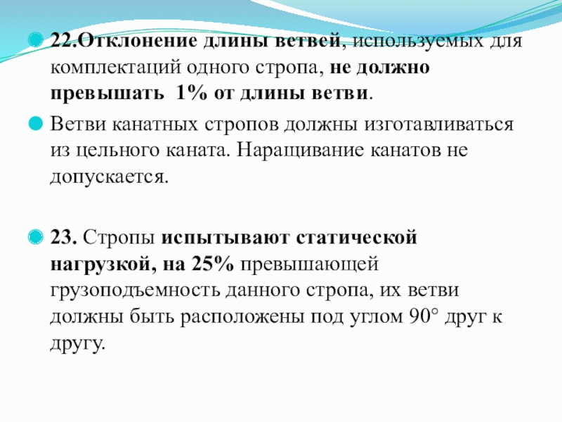 Слайд 2222.Отклонение длины ветвей, используемых для комплектаций одного стропа, не должно превышать