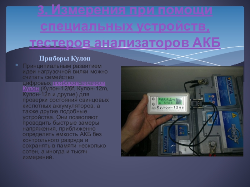 3. Измерения при помощи специальных устройств, тестеров анализаторов АКБ