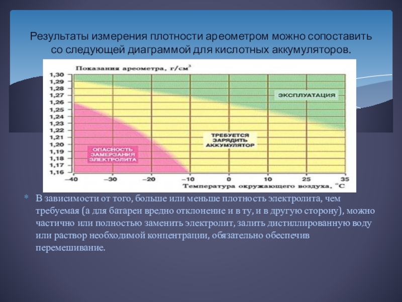 Результаты измерения плотности ареометром можно сопоставить со следующей диаграммой для кислотных аккумуляторов.