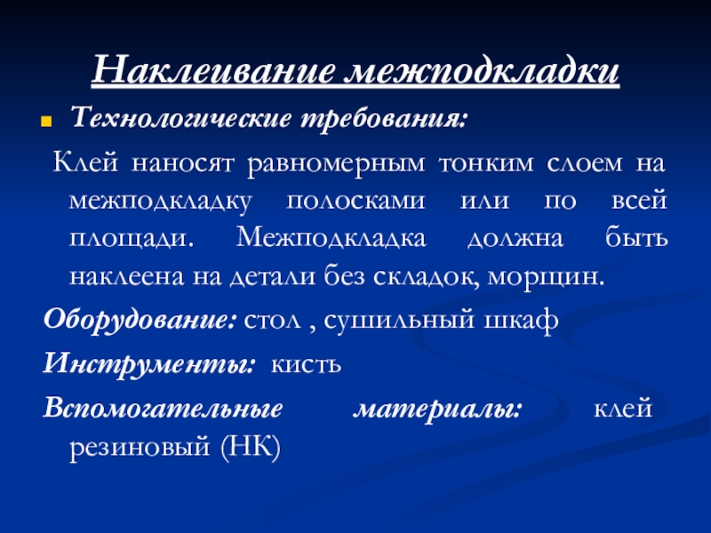 или по всей площади. Межподкладка должна быть наклеена на детали без складок, морщин.