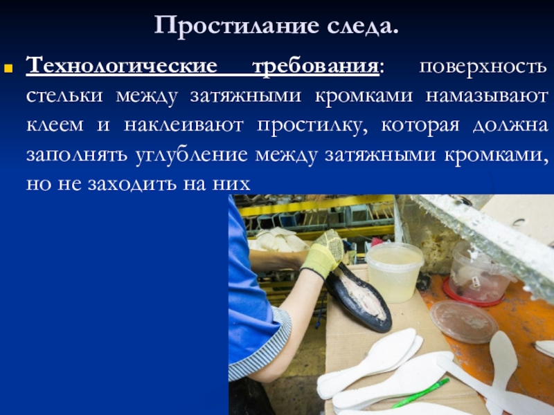 Технологические требования: поверхность стельки между затяжными кромками намазывают клеем и