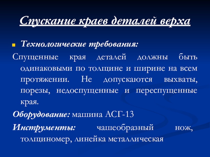 Слайд 8Спускание краев деталей – для утонения краев, обрабатываемых взагибку, в обжиг,