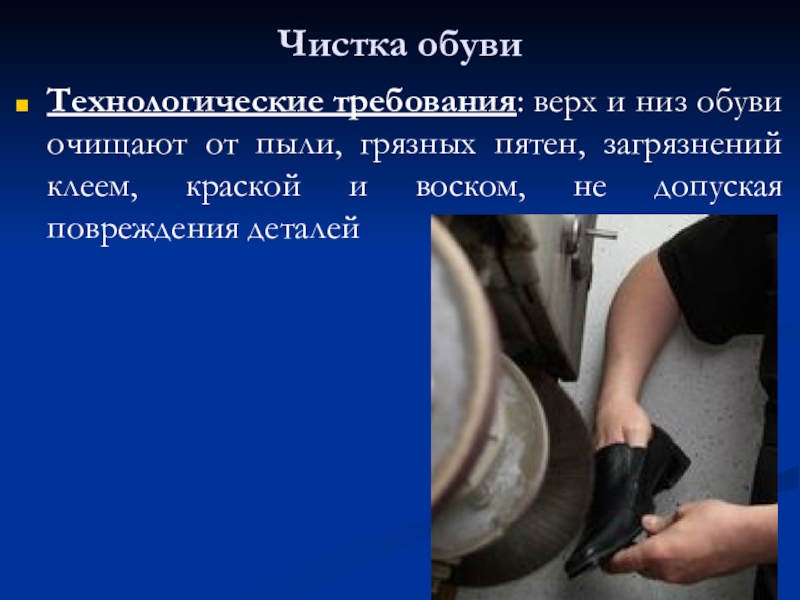Технологические требования: верх и низ обуви очищают от пыли, грязных