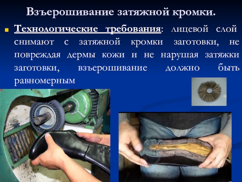 Технологические требования: лицевой слой снимают с затяжной кромки заготовки,