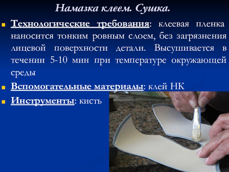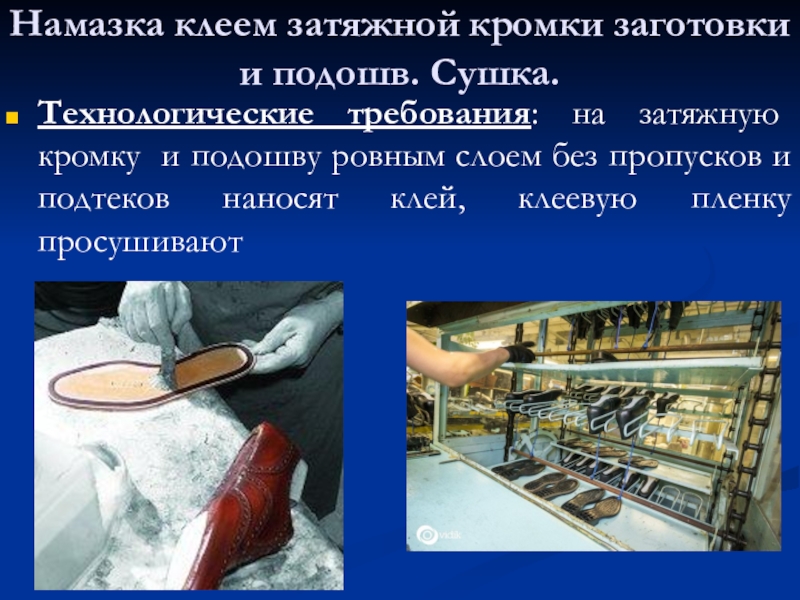 Слайд 64Намазка клеем затяжной кромки заготовки и подошв. Сушка.